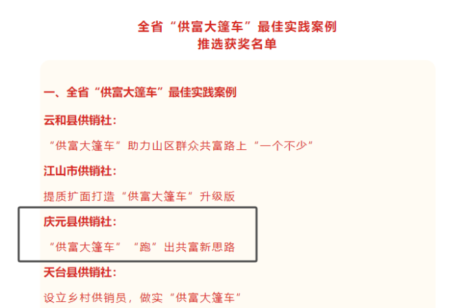 日前,浙江省全省供销社“供富大篷车”最佳实践案例推选路演活动在绍兴市嵊州市举办,庆元县供销社推选的《“供富大篷车”“跑”出共富新思路》获最佳实践案例,全省仅4家市(区、县)供销社获得该奖。